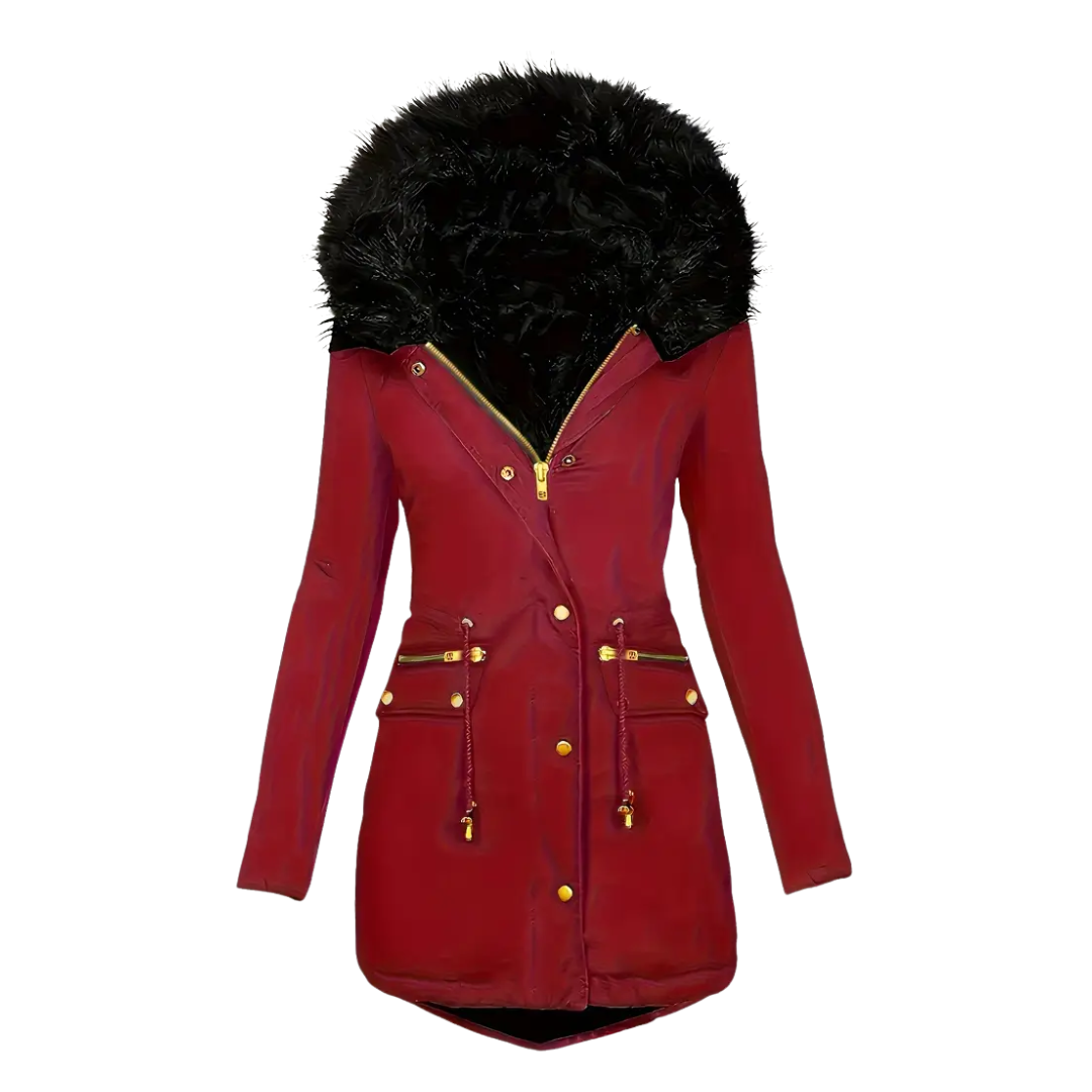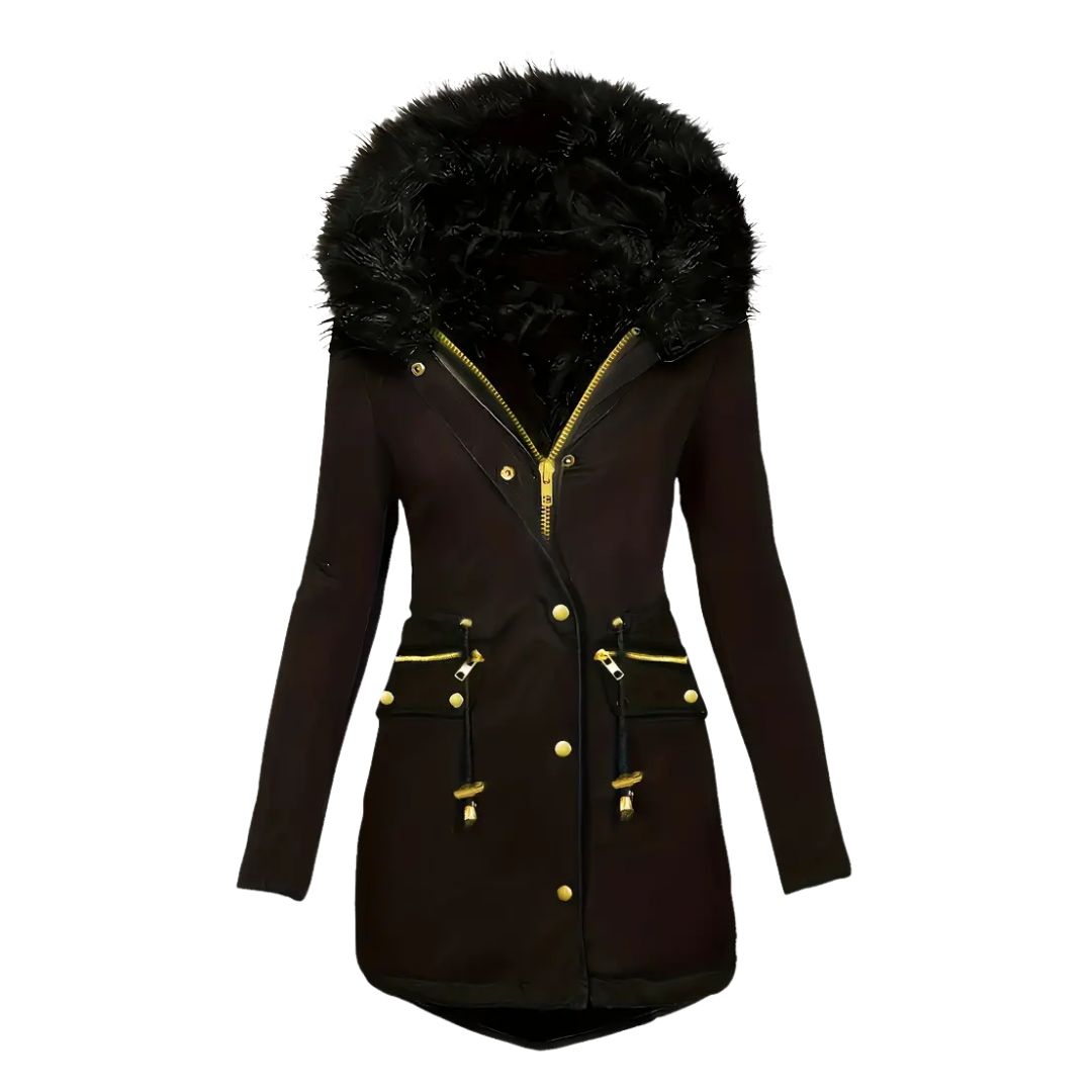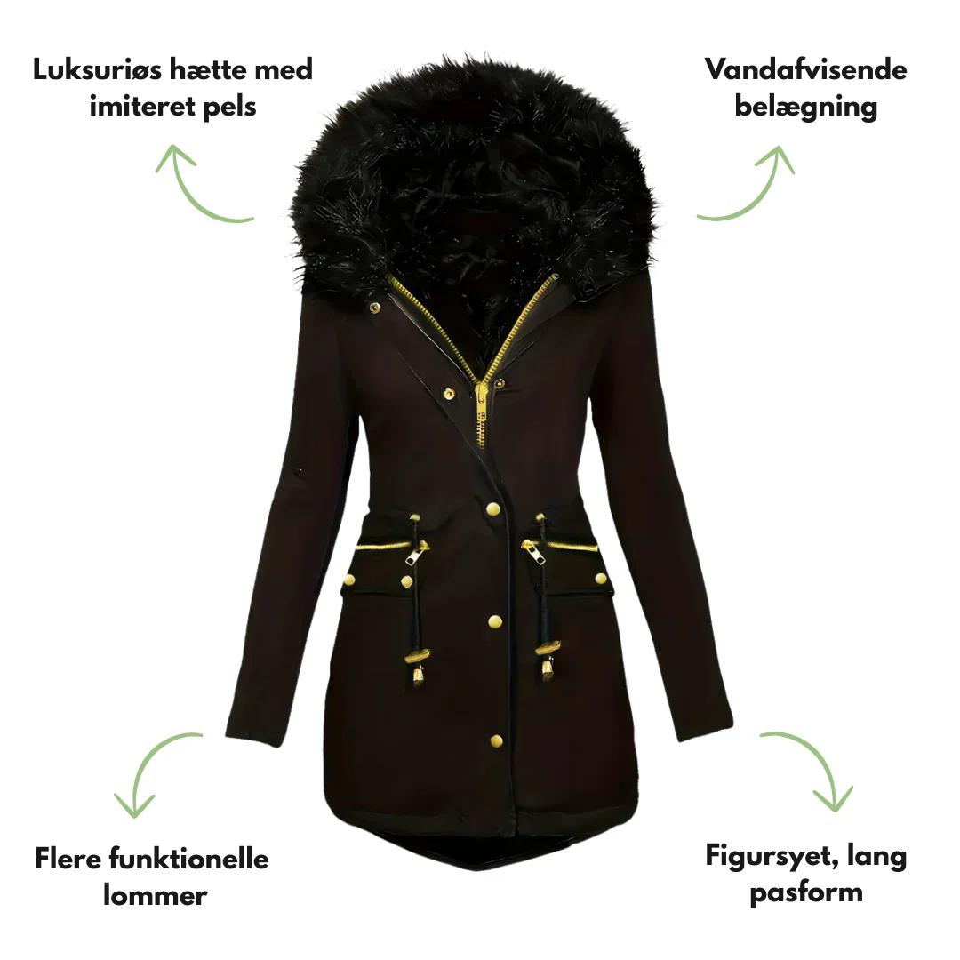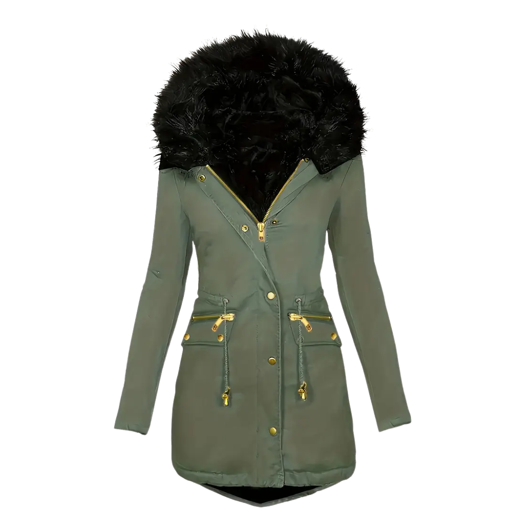 Denne stilfulde zip-up parka med knaplukning er din ideelle vinterjakke. Den rummelige hætte med blød imiteret pelskant holder kulde og vind ude, mens det halvlange snit og taljesnoren giver en feminin og justerbar pasform.