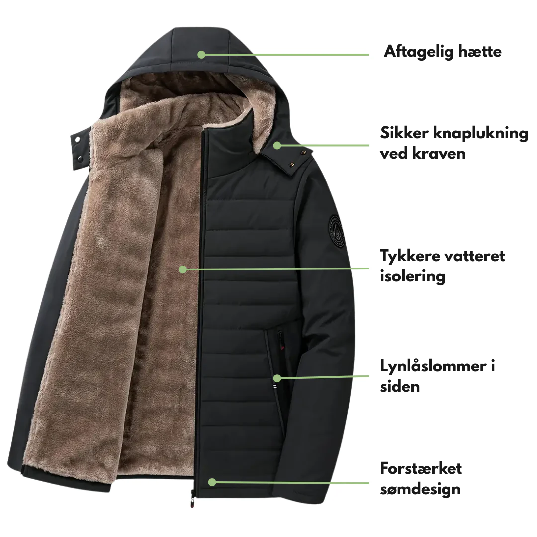 Hold dig varm og komfortabel på kolde dage med denne heavyweight herrejakke. Den isolerende fyld, bløde plysforing og aftagelige hætte giver pålidelig beskyttelse mod vinterkulden.